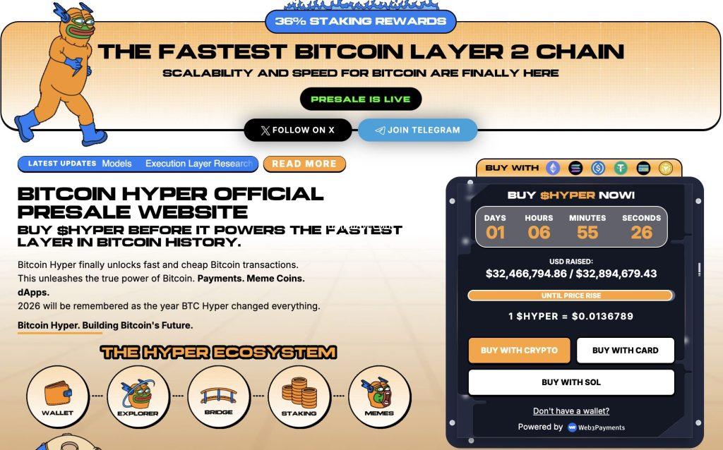 The presale has now raised $32,466,226.06 at a current price of $0.0136789 per $HYPER, with staking available at a high APY for early participants.